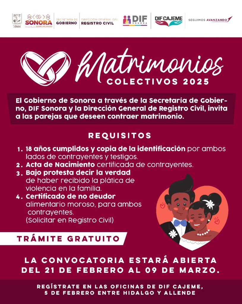 Cd. Obregón, Sonora.- La directora general del Sistema para el Desarrollo Integral de la Familia (DIF) Cajeme, maestra Claudia Fabiola Santacruz Avilés, en coordinación con el Registro Civil, anuncian la apertura de la convocatoria para los Matrimonios Colectivos 2025, iniciativa que busca brindar certeza jurídica a todas las parejas del municipio, ofreciéndoles la oportunidad de formalizar su unión de manera completamente gratuita.