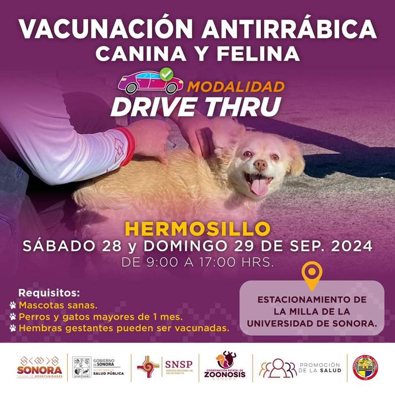 Hermosillo, Sonora.- La Secretaría de Salud (SSP) inicia este sábado la vacunación antirrábica con modalidad drive thru (auto servicio) en la capital sonorense, esto con la finalidad de inmunizar a la mayor cantidad de mascotas.