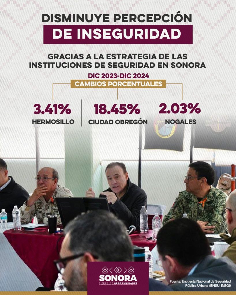 Por su parte, estas acciones han permitido que en Hermosillo se registrara una reducción en la percepción de inseguridad de sus habitantes, al pasar del 46.9% al 45.3%, mientras que en Nogales también se presentó una disminución, al bajar del 39.5% al 38.7%. Esto demuestra el esfuerzo constante de las instituciones en esa región en cuanto a seguridad.
