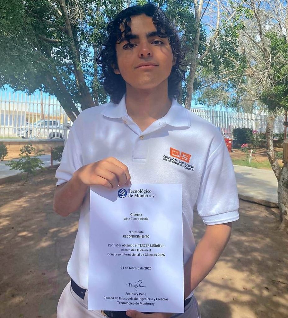 Hermosillo, Sonora.- Alan Flores Alaniz, estudiante del Colegio de Bachilleres del Estado de Sonora (Cobach), plantel Caborca, obtuvo el tercer lugar en la final del Concurso Internacional de Ciencias 2026, organizado por el Instituto Tecnológico y de Estudios Superiores de Monterrey, en la rama de Física, tras competir con más de dos mil 300 jóvenes de distintos países.