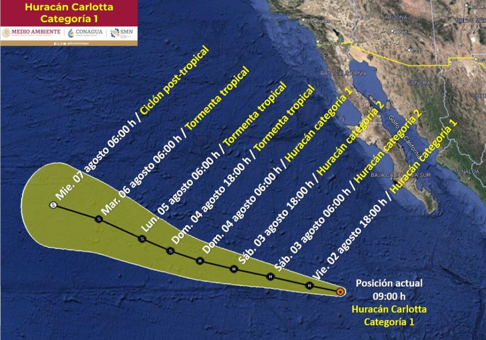 Cd. de México (agencias).- El Servicio Meteorológico Nacional dio a conocer que Carlotta se intensificó a huracán categoría 1 en la escala Saffir-Simpson, y se encuentra al suroeste de la península de Baja California.