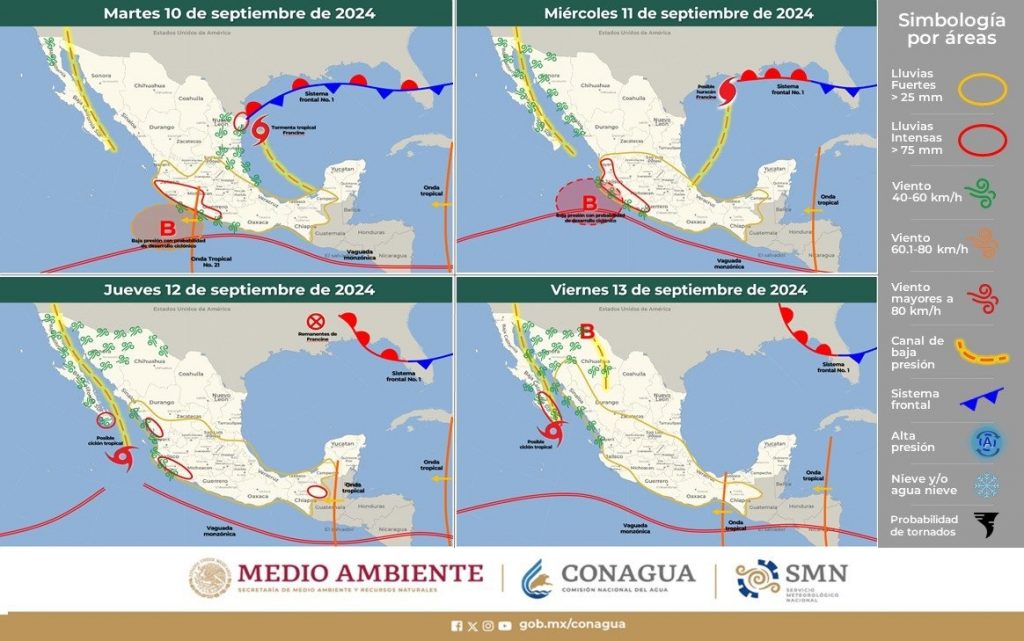 Cd. de México (agencias).- El clima en México hoy 9 de septiembre del 2024, se espera que la tormenta tropical Francine, en las costas de Tamaulipas, en combinación el frente frío 1 y la onda tropical 21, provocarán lluvias intensas a puntuales torrenciales con descargas eléctricas y rachas de viento en el noreste, oriente, sur y sureste del País.