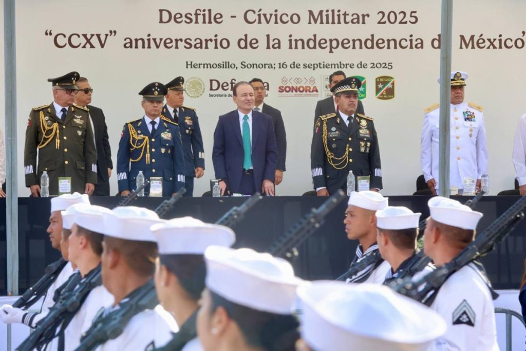 Hermosillo, Sonora.- Ante cientos de familias que acudieron para disfrutar del tradicional espectáculo del desfile cívico militar, por la celebración para conmemorar el 215 aniversario de la Independencia de México, el Gobernador Alfonso Durazo Montaño encabezó la ceremonia que contó con la participación de mil 488 personas y el despliegue de 79 unidades automotores.