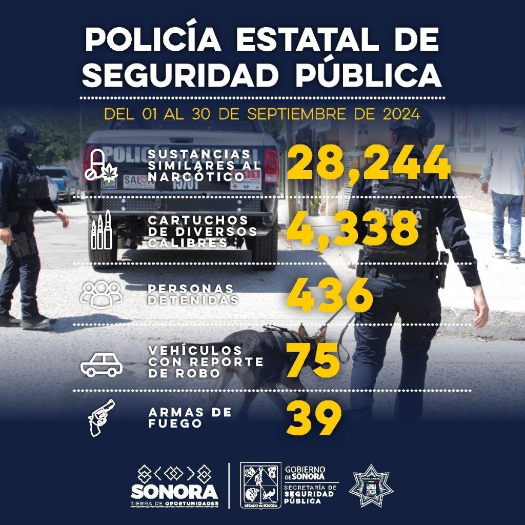 Hermosillo, Sonora.- Trabajo táctico y de inteligencia que realizó la Secretaría de Seguridad Pública (SSP) durante septiembre, a través de la Policía Estatal de Seguridad Pública, generó el aseguramiento de 436 personas, además de incautar armas de fuego, vehículos y sustancias prohibidas.