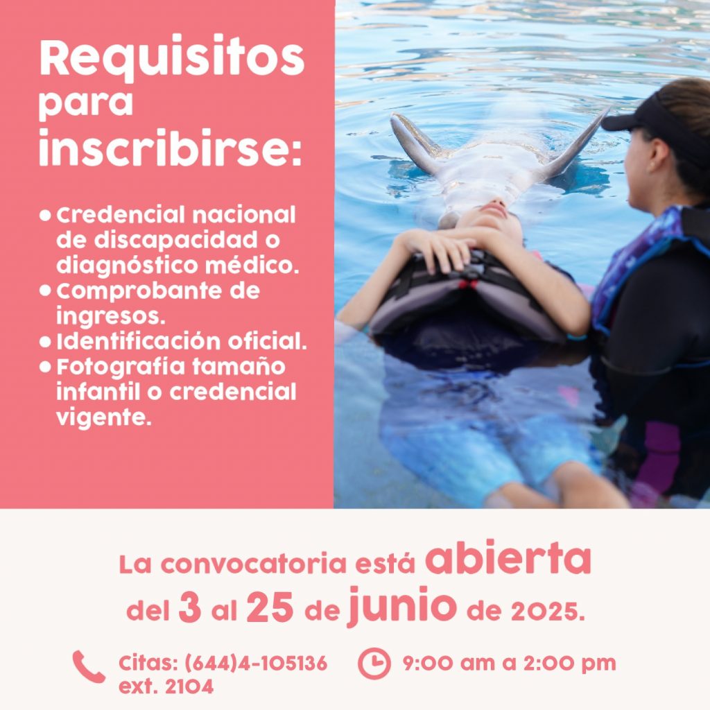 Cd. Obregón, Sonora.- El Sistema para el Desarrollo Integral de la Familia (DIF) Cajeme en coordinación con el Sistema DIF Sonora informa a la comunidad que a partir de hoy se encuentra abierta la convocatoria para acceder al programa de terapia asistida con delfines, completamente gratuita, dirigida a personas con autismo, parálisis cerebral infantil y discapacidad intelectual.