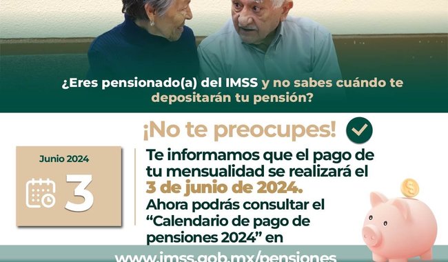 El depósito de la pensión está garantizado; se invita a la población pensionada a consultar el calendario del pago de pensiones 2024 en la página www.imss.gob.mx/pensiones y acceder al banner “Conoce el calendario de pago de pensiones 2024 aquí”.