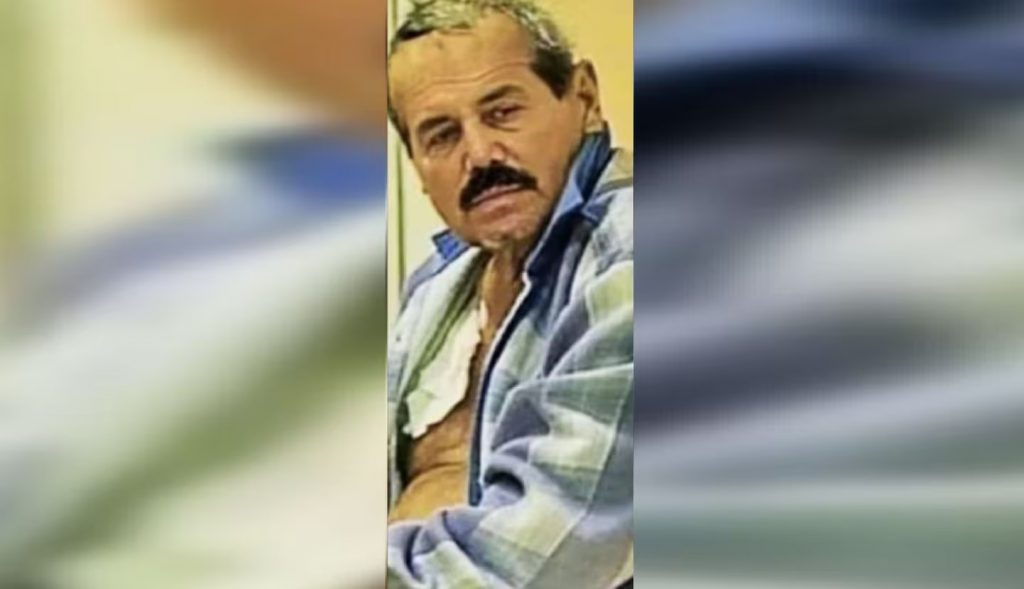 Se le ve con entradas en el cabello, un bigote pronunciado, así como arrugas en la frente. En la imagen porta una camisa de cuadros azules con blancos y un vendaje en el lado derecho del pecho, mismo que no muestra signos de sangre o de alguna herida.