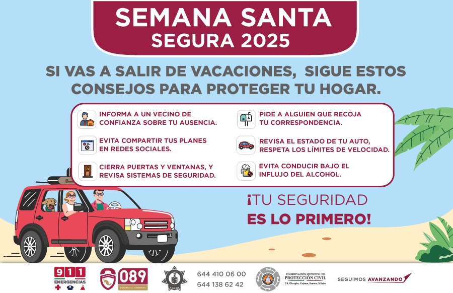 Cd. Obregón, Sonora.- La Secretaría de Seguridad Pública Municipal (SSPM) recomienda a las y los ciudadanos que planean salir de viaje durante la Semana Santa 2025, medidas para garantizar la seguridad vial y prevenir accidentes.