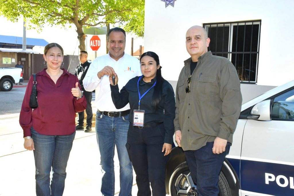 Junto al comisario general de la Jefatura de Policía Preventiva y Tránsito Municipal, Manuel Emilio Hoyos, entregó las llaves de la unidad a la oficial Zulema Jiménez para la vigilancia permanente en el sector.