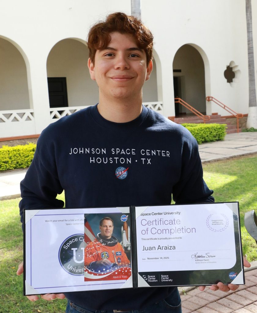 Hermosillo, Sonora.- Juan Carlos Araiza Bernal, estudiante de séptimo semestre de Ingeniería en Sistemas de la Información en la Universidad de Sonora, presentó en el Centro Espacial Lyndon B. Johnson de la NASA, en Houston, Texas, un proyecto interdisciplinario que integra el desarrollo de un polímero innovador y la creación de un sistema informático para su implementación y gestión experimental.