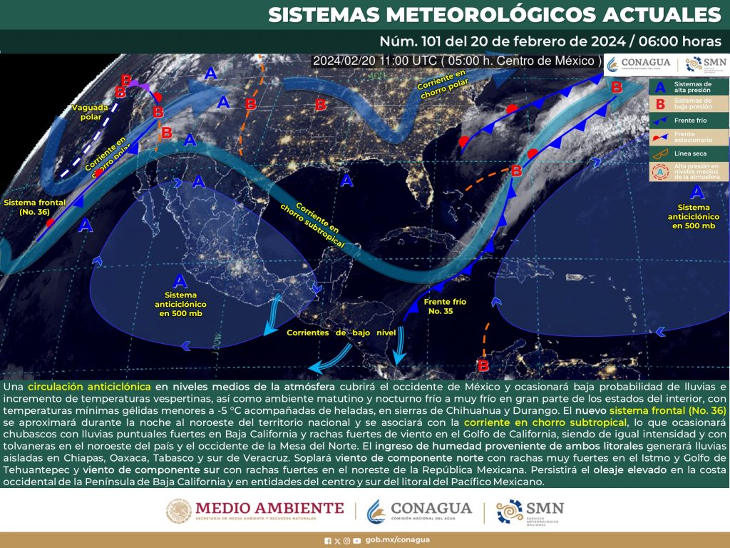 Cd. de México (agencias).- México espera la entrada del frente frío 36 durante la noche al noroeste del País y se asociará con la corriente en chorro subtropical que provocará fuertes rachas de viento, intervalos de chubascos y lluvias fuertes en algunas partes.