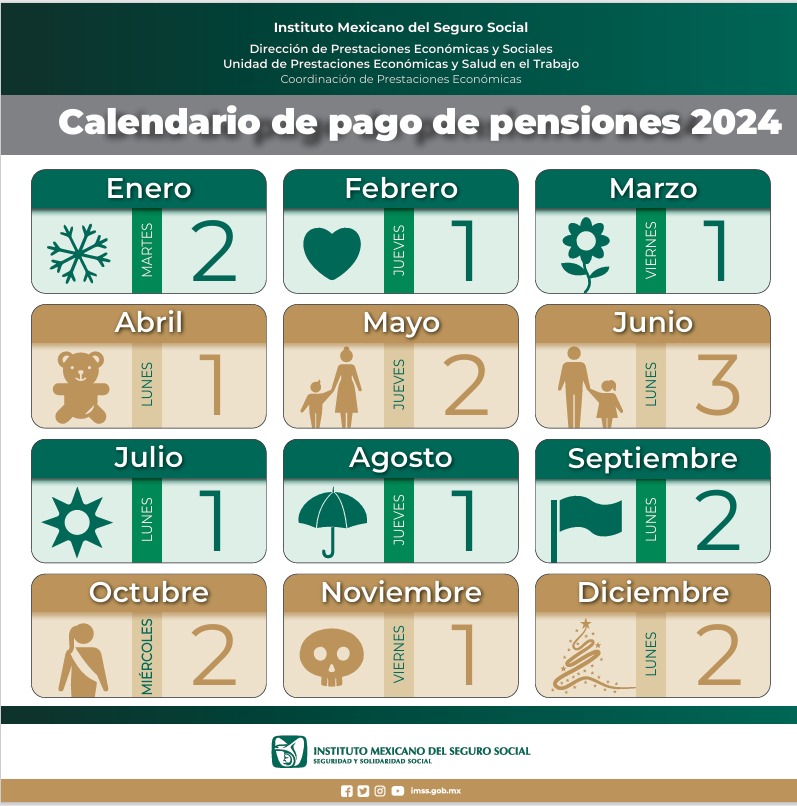 • En el portal www.imss.gob.mx/pensiones se puede consultar y descargar el calendario de pago de pensiones 2024