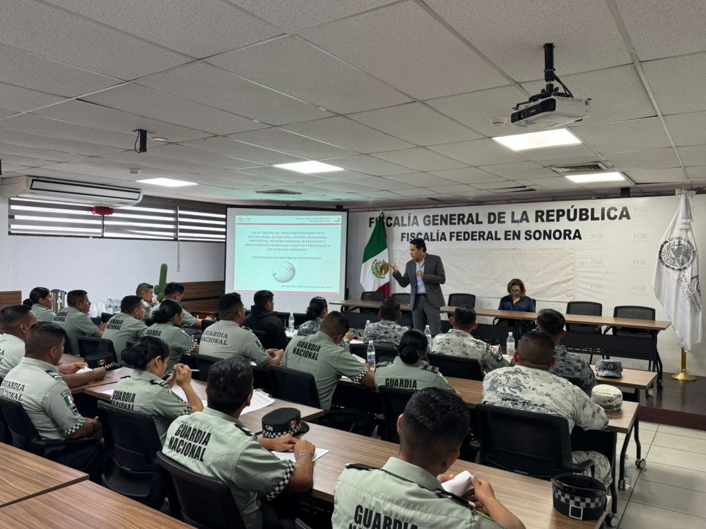 Hermosillo, Sonora.- La Fiscalía General de la República (FGR) a través de la Fiscalía Especializada de Control Regional (FECOR) en el Estado de Sonora, impartió una capacitación a elementos de la Guardia Nacional sobre la actuación del primer respondiente en el Sistema Penal Acusatorio, control provisional preventivo, Registro Nacional de Detenidos y procesamiento de indicios, respeto y protección de los derechos humanos, detención de adolescentes y perspectiva de género.