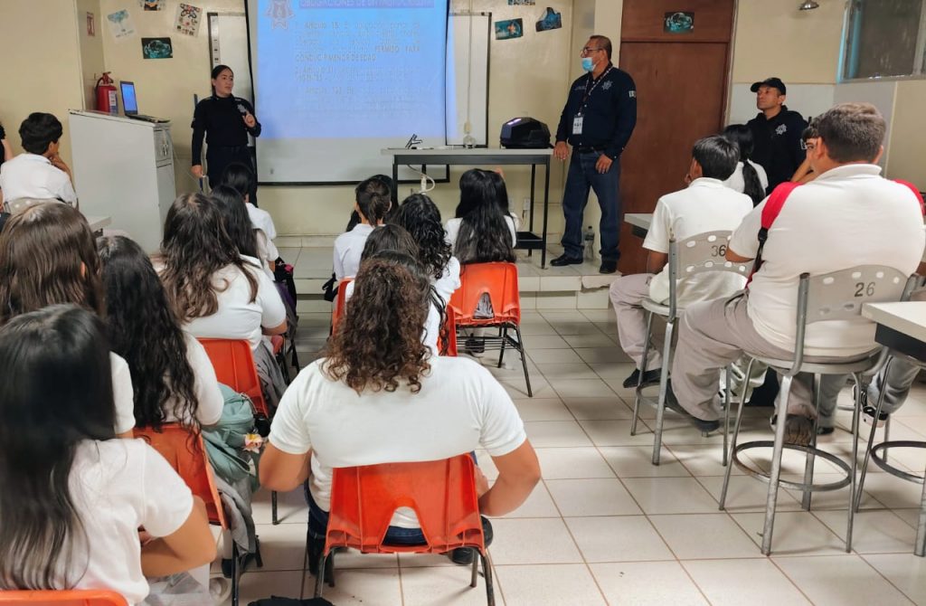 Cajeme, Sonora.- Con el objetivo de generar conciencia entre las y los jóvenes sobre los riesgos que amenazan su salud y seguridad, la Dirección de Programas Preventivos de la Secretaría de Seguridad Pública Municipal impartió una plática informativa a estudiantes de primer y quinto semestre de la Preparatoria Cobach, ubicada en Quetchehueca.