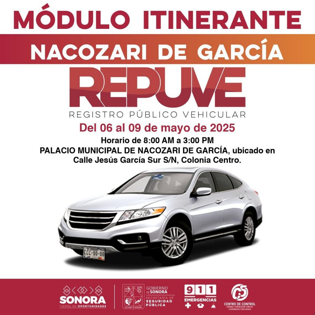 Nacozari de García, Sonora.- Para beneficiar a la ciudadanía interesada en realizar el trámite de regularización de autos usados de procedencia extranjera, el Gobierno de Sonora trasladó el módulo itinerante del Registro Público Vehicular (Repuve) al Municipio de Nacozari de García.