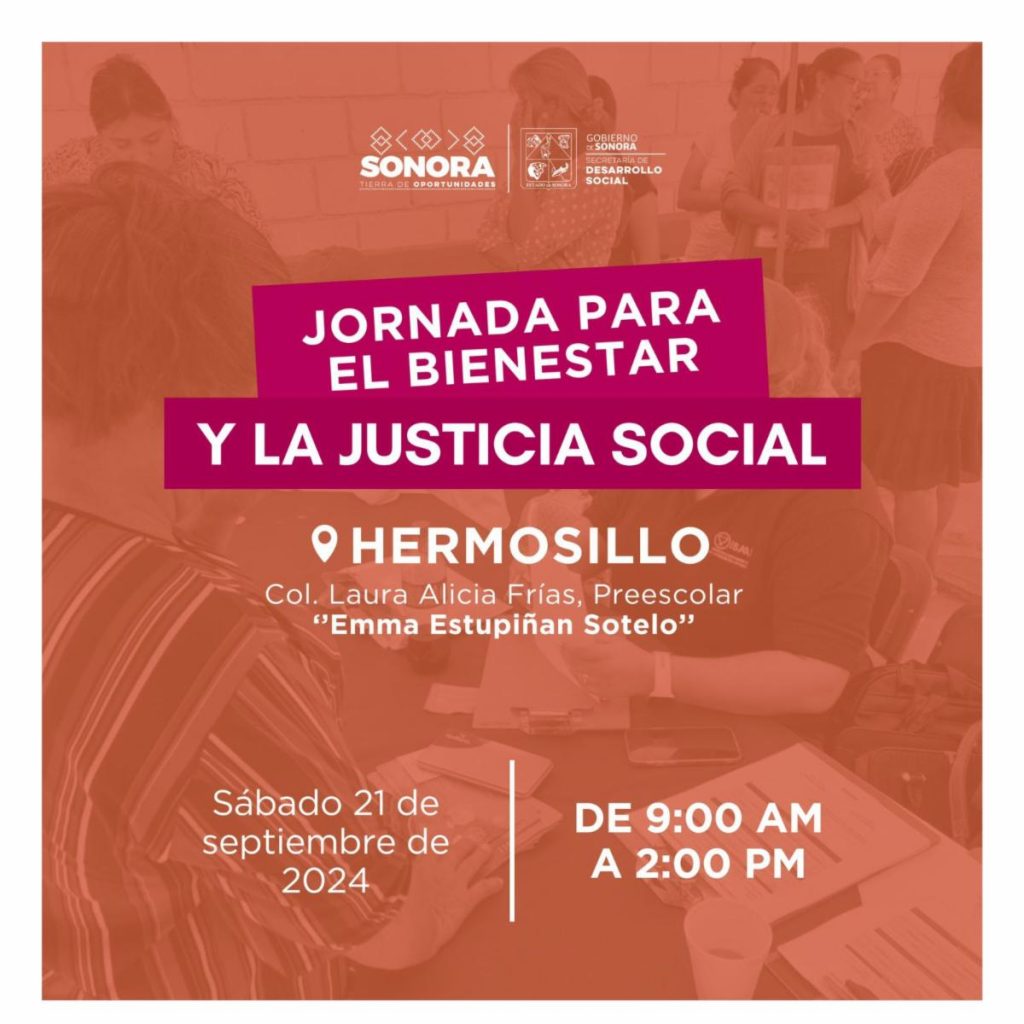 Hermosillo, Sonora.- Con el fin de acercar más de 50 trámites y servicios gratuitos a la comunidad hermosillense el Gobierno de Sonora, a través de la Secretaría de Desarrollo Social (Sedesson), invita a la próxima Jornada para el Bienestar y la Justicia Social en la colonia Laura Alicia Frías de López Nogales.