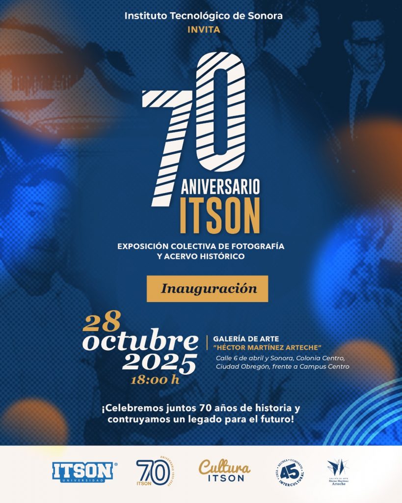 Cd. Obregón, Sonora.- Como parte de las celebraciones por su 70 aniversario, el Instituto Tecnológico de Sonora (ITSON), a través de la Dirección de Extensión Universitaria y el Departamento de Extensión de la Cultura, invita a la inauguración de la exposición “70 Aniversario ITSON: Exposición colectiva de fotografía y acervo histórico”, el 28 de octubre, a las 18:00 horas, en la Galería de Arte “Héctor Martínez Arteche”.