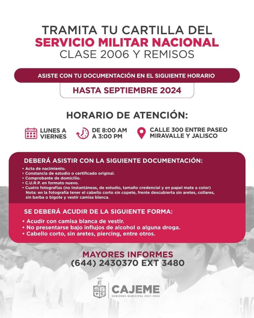 Cd. Obregón, Sonora.- La Junta Municipal de Reclutamiento de Cajeme invita a las y los jóvenes de la clase 2006, remisos y mujeres voluntarias, a realizar el trámite para obtener su Cartilla del Servicio Militar Nacional, un documento oficial que les abrirá puertas en el ámbito laboral, académico y social.