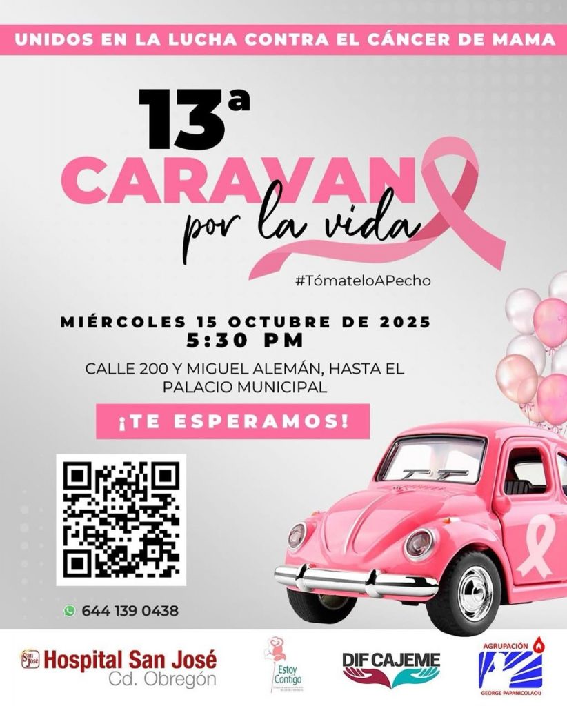 Cd. Obregón, Sonora.- Con el objetivo de sensibilizar a la ciudadanía sobre la importancia de la detección temprana del cáncer de mama, el DIF Cajeme, en coordinación con Hospital San José, la Agrupación George Papanicolaou y la Asociación Estoy Contigo, invitan a toda la comunidad a participar en la 13ª Caravana por la Vida, que se realizará el próximo miércoles 15 de octubre a las 5:30 de la tarde.
