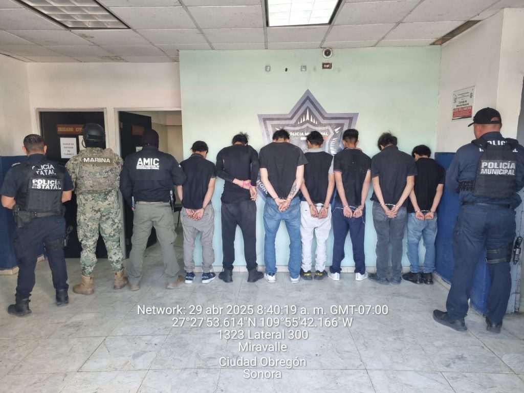 Cd. Obregón, Sonora.- Derivado de acciones coordinadas entre la Secretaría de Seguridad Pública Municipal (SSPM), Secretaría de Marina, Defensa, Policía Estatal y Fiscalía General de Justicia del Estado, se logró el rescate de una persona víctima de privación ilegal de la libertad y la detención de siete personas originarias de Hermosillo, así como el aseguramiento de armamento, droga, vehículo y equipo táctico.