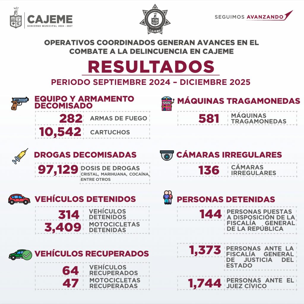 Cd. Obregón, Sonora.- Como resultado del trabajo coordinado entre la Secretaría de Seguridad Pública Municipal (SSPM), la Policía Estatal, la Secretaría de Marina, la Secretaría de la Defensa Nacional, Guardia Nacional, Agencia Ministerial de Investigación Criminal (AMIC) y demás instancias de seguridad, se han obtenido resultados relevantes en el fortalecimiento de la seguridad y el combate a la delincuencia durante el periodo comprendido de septiembre de 2024 a diciembre de 2025, es decir, lo que va de esta administración municipal.