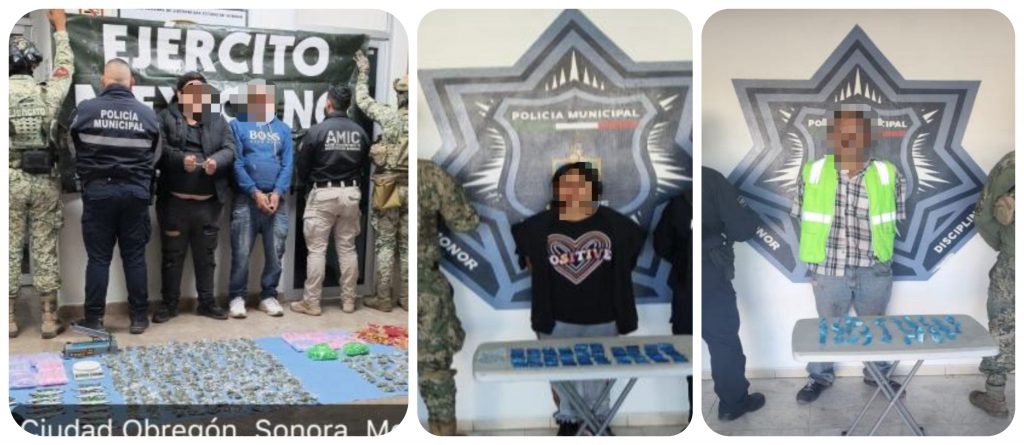 Cd. Obregón, Sonora.- Tras acciones operativas realizadas este fin de semana en Cajeme, la Secretaría de Seguridad Pública Municipal, Policía Estatal, Marina y Defensa, realizaron detenciones y el aseguramiento de presuntas dosis de droga y vehículos.