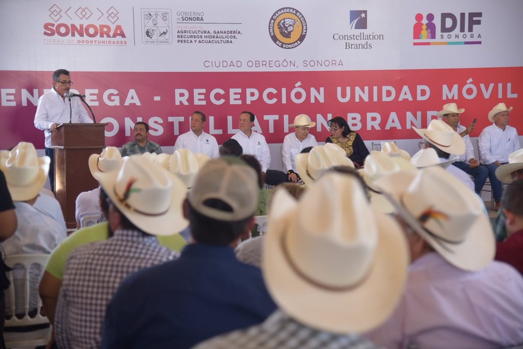 Cd. Obregón, Sonora.- Al participar junto con el Gobernador Alfonso Durazo Montaño en la entrega de una unidad móvil que facilitará el transporte de alimentos para el ganado, el Presidente Municipal de Cajeme, Javier Lamarque Cano reconoció el compromiso social que la empresa Constellation Brands ha sostenido con los pequeños productores de leche del Valle del Yaqui y de la región sur de Sonora, pues no sólo los beneficia con el suministro de gabazo, sino que también contribuye a su distribución.