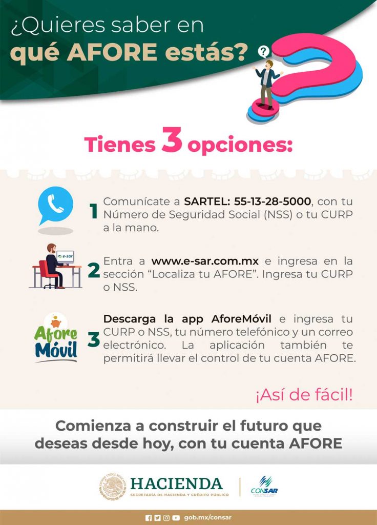 Otra opción es visitar el sitio web www(.)e-sar(.)com(.)mx y seleccionar la sección «Localiza tu AFORE», donde podrás ingresar tu CURP o NSS para obtener la información.