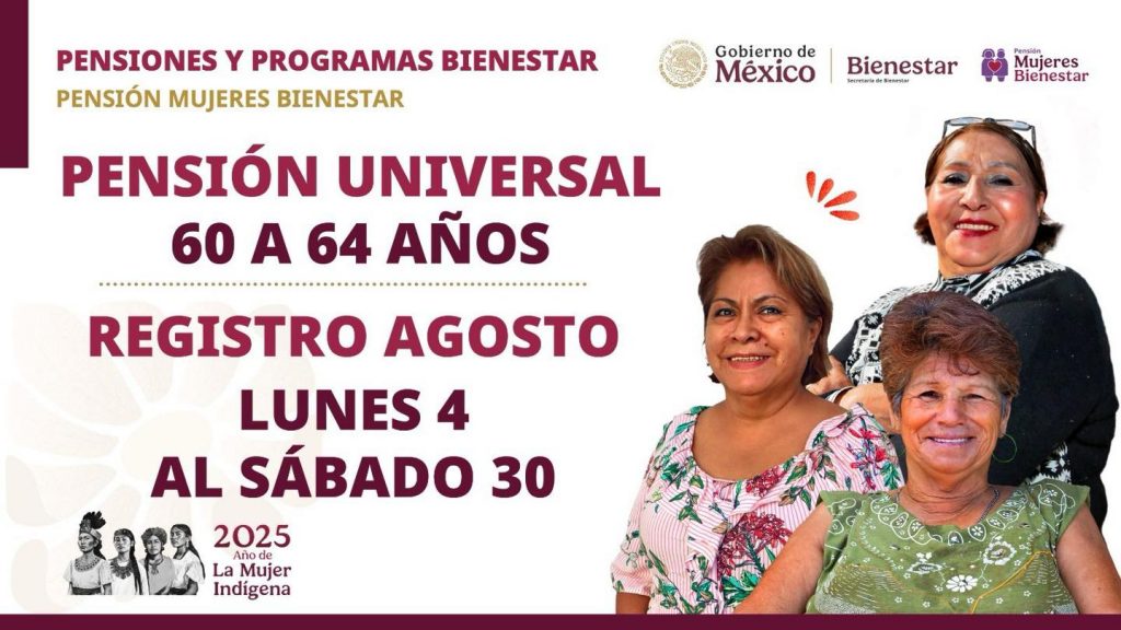 El registro para la Pensión Mujeres Bienestar arrancará el próximo 4 de agosto y concluirá el 30 del mismo mes. Quienes deseen incorporarse deberán acudir a los módulos de Bienestar, de lunes a viernes, entre las 10:00 a.m. y 4:00 p.m.