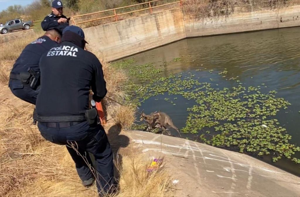 Huatabampo, Sonora.- Durante recorridos de prevención y vigilancia realizados por la Secretaría de Seguridad Pública (SSP), elementos de la Policía Estatal lograron identificar a un venado, que se encontraba en riesgo al quedar atrapado dentro de un canal de agua.
