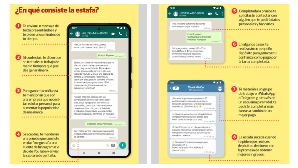 Cd. de México (agencias).- Los “montalikes” son supuestos empleadores que ofrecen trabajos sumamente atractivos, pero terminan estafando a los usuarios a través de WhatsApp. Por esta razón, la Procuraduría Federal del Consumidor (Profeco) lanzó una alerta al respecto en la Revista del Consumidor de abril.