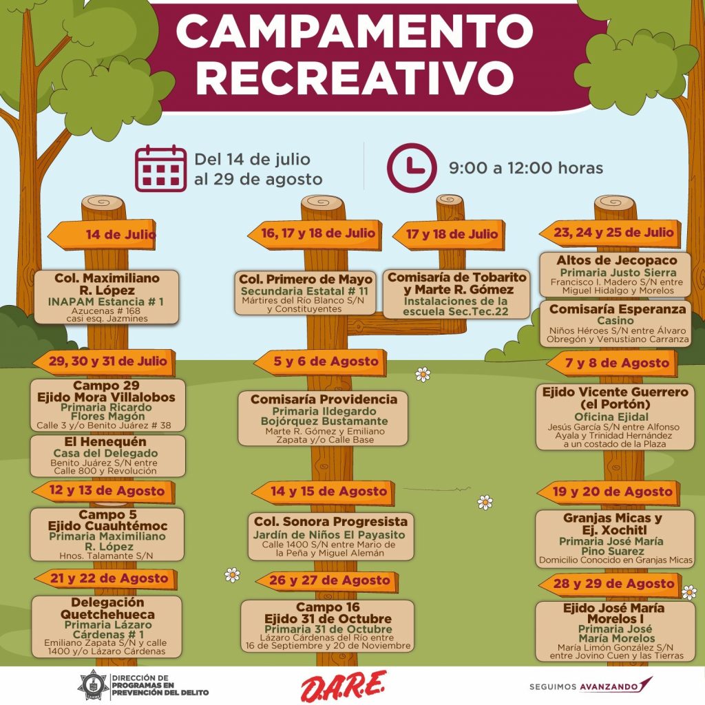 Cd. Obregón, Sonora.- La Dirección de Programas Preventivos de la Secretaría de Seguridad Pública Municipal (SSPM) llevará a cabo campamentos recreativos de verano del 14 de julio al 29 de agosto, con el objetivo de fomentar la sana convivencia, la recreación y el bienestar entre distintos sectores de la población.