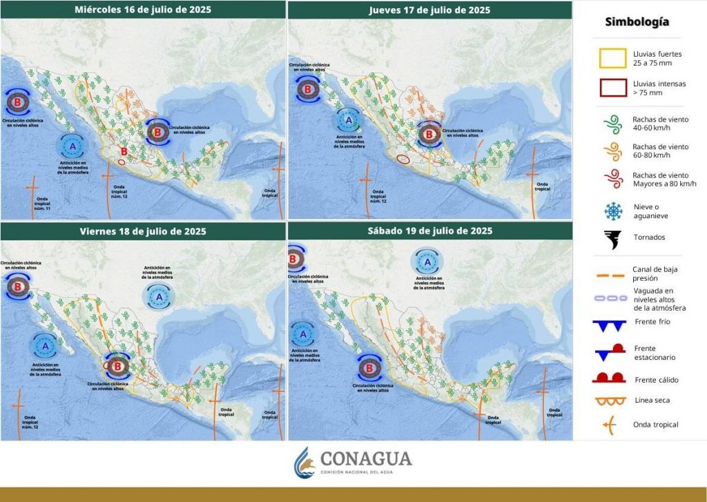 Hoy, el monzón mexicano en el noroeste del País, mantendrá condiciones muy favorables para la probabilidad de lluvias fuertes a muy fuertes (25mm a 50mm) acompañadas con descargas eléctricas durante el horario vespertino en la región de la Sierra Madre Occidental. También se prevé viento con rachas de 40 a 60 km/h sobre el Golfo de California.
