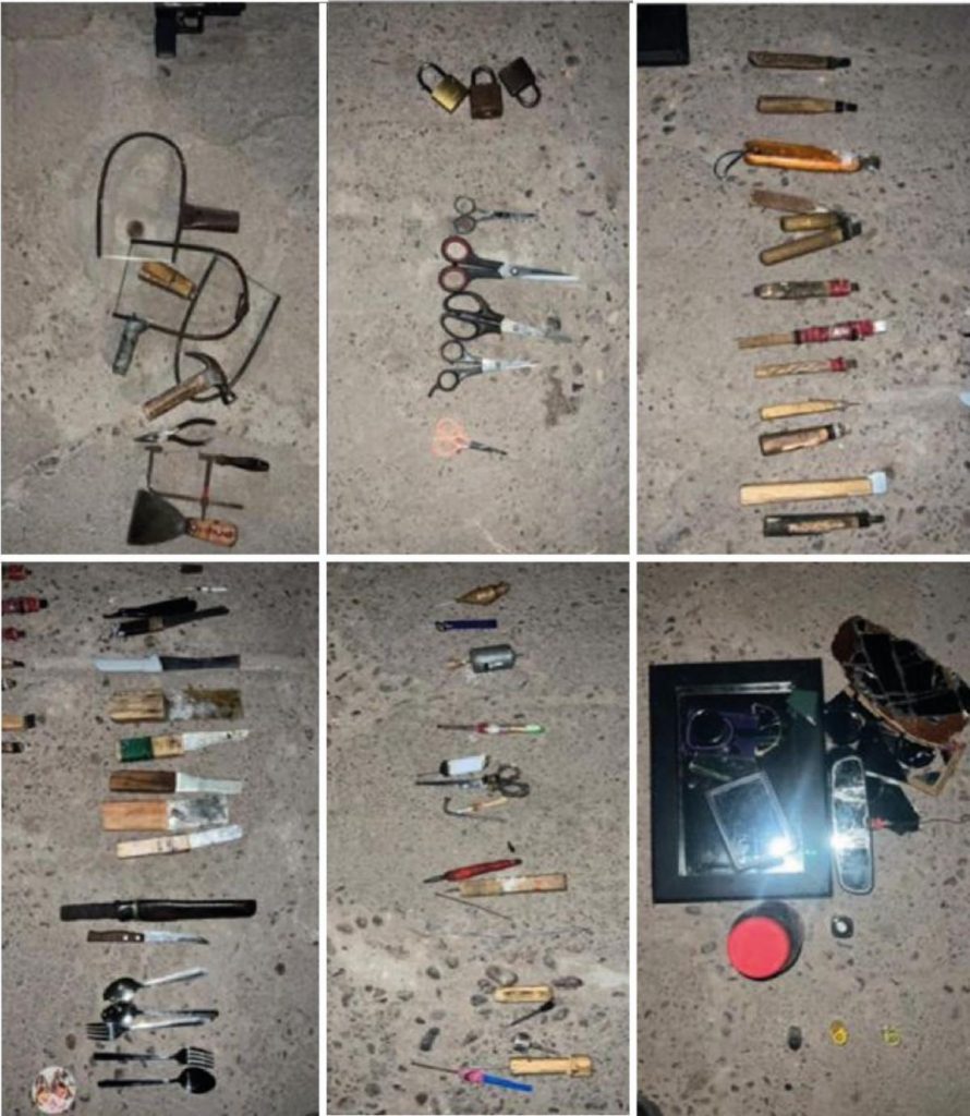 Como resultado, se logró el decomiso de diversos objetos prohibidos, incluyendo buriles, arcos de segueta, martillo, pinza, punta, cuchillo, cucharas metálicas, tijera, ponchadores, espejos de vidrio, frasco y una pistola hechiza de madera.