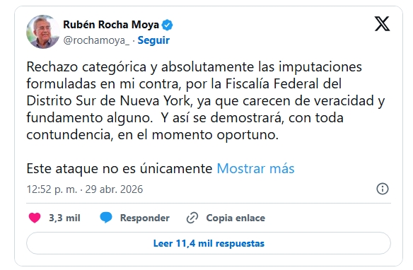 - Rubén Rocha Moya, Gobernador de Sinaloa, rechazó los señalamientos de EE.UU. de sus presuntos vínculos con el narcotráfico