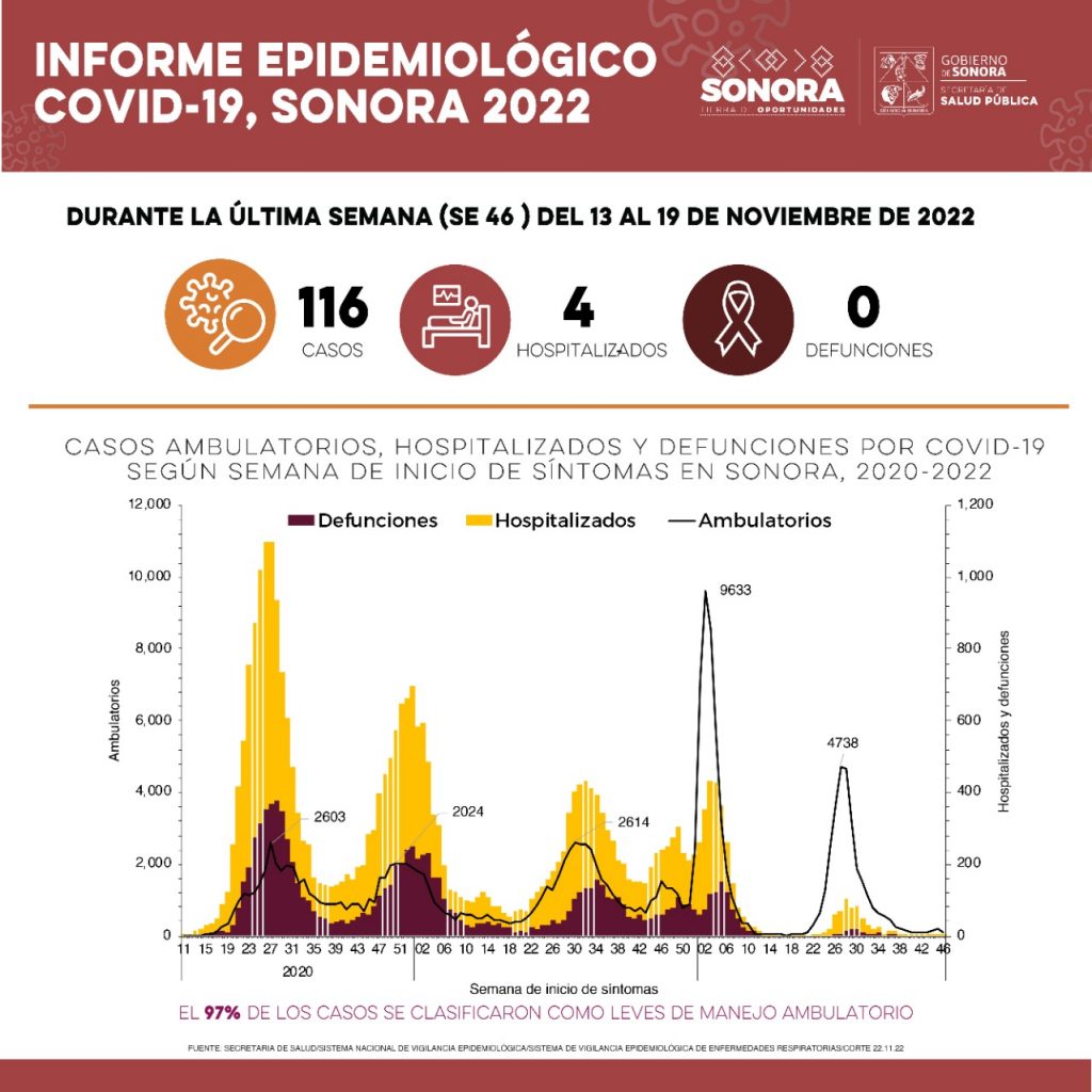 Hermosillo, Sonora.- La Secretaría de Salud confirmó 116 nuevos casos de Covid-19 y ninguna defunción, esto durante la semana epidemiológica 46, que abarca del 13 al 19 de noviembre.