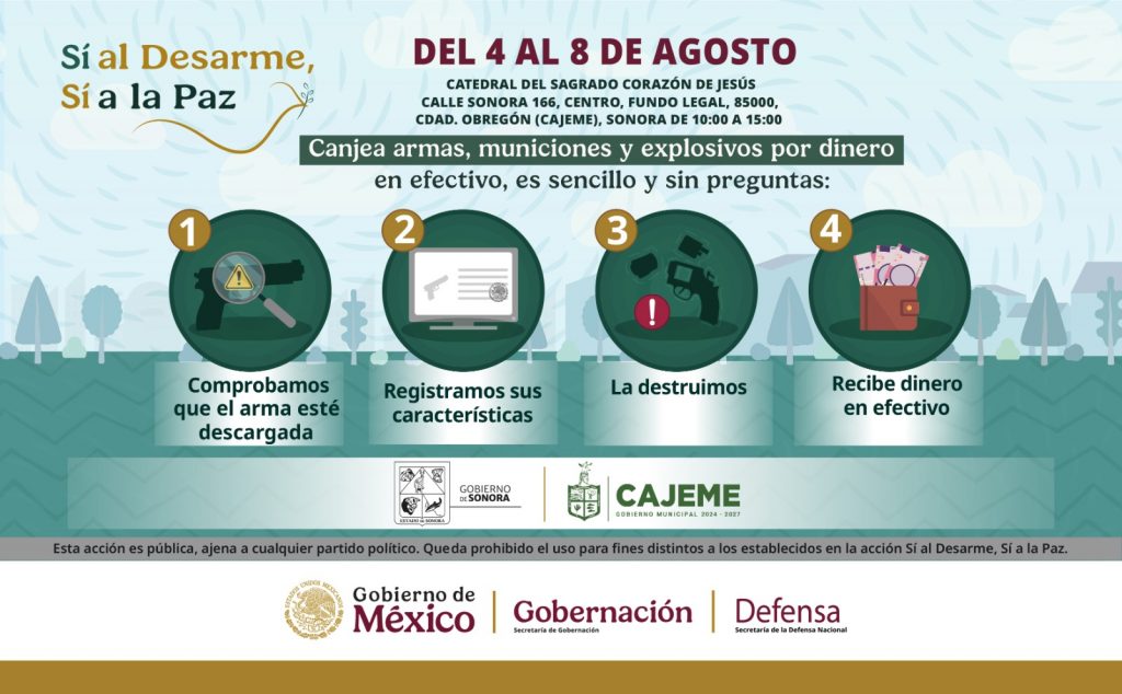 Cd. Obregón, Sonora.- Derivado de la buena aceptación del programa de desarme voluntario “Sí al Desarme, Sí a la Paz”, se crearán nuevas fechas para el Municipio de Cajeme, mismas que comprenderán del 4 al 8 de agosto.
