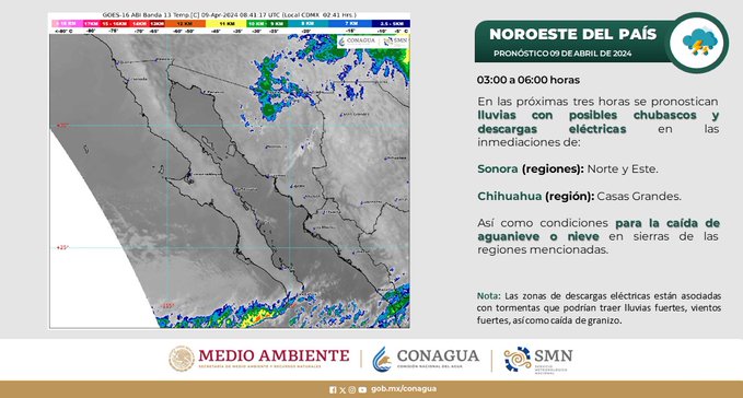 Se espera que existan vientos fuertes a muy fuertes con tolvaneras en todo el norte del País, con condiciones por la mañana para la caída de nieve o aguanieve en zonas de Sonora y Chihuahua.