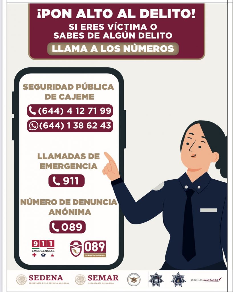 Cd. Obregón, Sonora.- La Secretaría de Seguridad Pública Municipal (SSPM) de Cajeme reitera a la ciudadanía la disponibilidad de los números de emergencia 911 y 089 para denuncias anónimas, con el objetivo de mantener la seguridad y bienestar de la población.