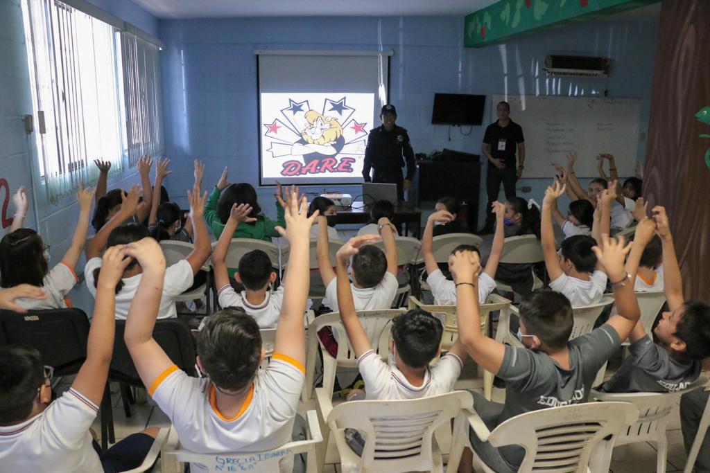 Durante la visita a la primaria Luis Encinas de la colonia Quinta Díaz, el oficial de la Policía Municipal e instructor DARE, Benjamín Bernal, explicó a las y los niños sobre las sustancias ilícitas en contra de la salud, así como cuáles son las consecuencias de su consumo y los riesgos.