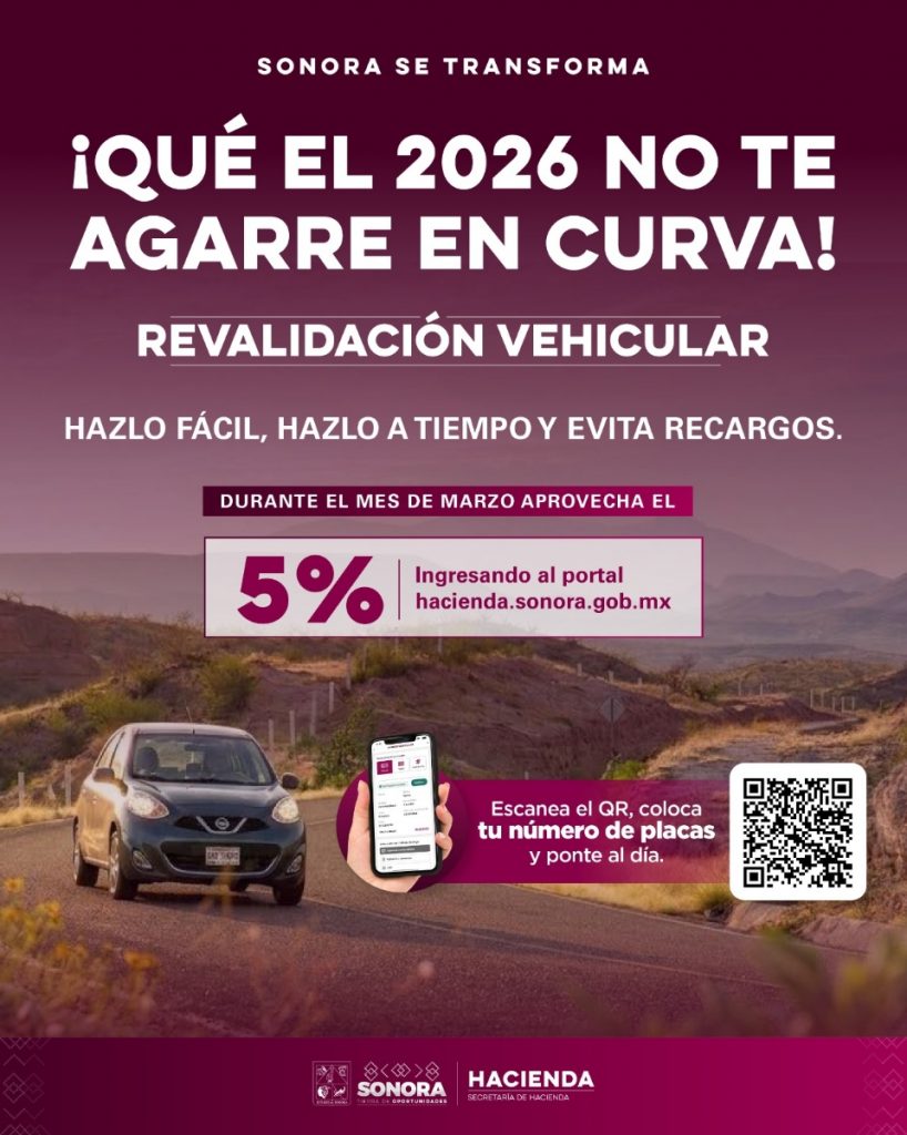 Hermosillo, Sonora.- El Gobierno de Sonora, a través de la Secretaría de Hacienda, invita a las y los contribuyentes que no han realizado su revalidación vehicular a aprovechar los descuentos y evitar recargos.