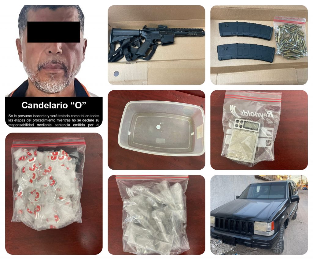 A esta persona le aseguraron un arma de fuego tipo fusil, dos cargadores para arma de fuego, 62 cartuchos útiles, una báscula gramera, 196 envoltorios que contenían en conjunto 81 gramos 900 miligramos de metanfetamina, 37 gramos 600 miligramos de marihuana y un vehículo con placas de circulación del Estado de California, E.U.A.